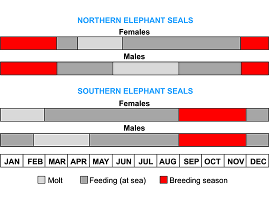 They have a mixed life style, with two aquatic phases and two land phases (breeding and molting). The strong adaptation to aquatic life reduces the mobility on land, and this favors grouping and male control of females.