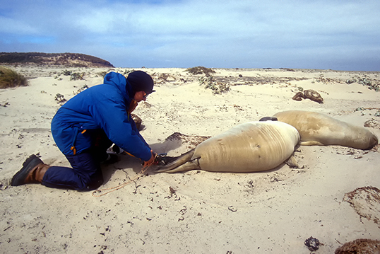 Marking of individuals is the single most important activity during our field work. To be able to recognize individuals during each breeding season and across consecutive seasons we mark each animal appearing on the beach by cattle tags. Every breeding season we mark 97-99% of the breeding females, all the breeding males, all pups, and a large sample of subadult males. The tag is applied to the interdigital web of the hind flippers using a special applicator: tagging is not particularly painful, pain is localized and of short duration, and the vast majority of elephant seals are not upset by tagging.