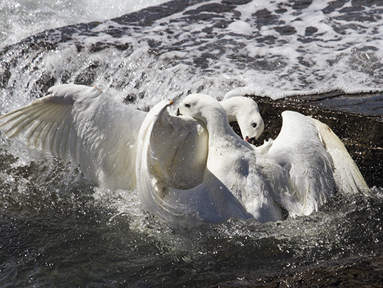 Kelp geese ara abundant at Sea Lion Island, and nesting pairs are scattered all along the coastline; the species is strongly territorial, and males can be involved in all-out fights, in which often one of the two get wounded
