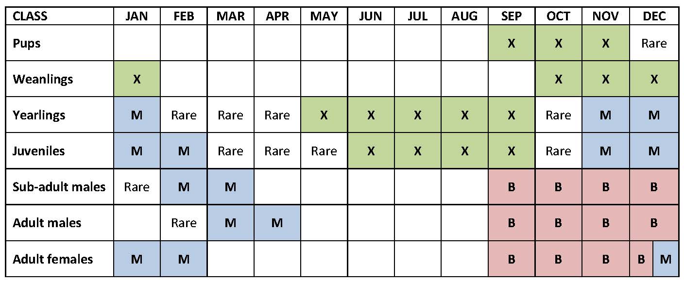 Presence on land: most adult females are present on land during the breeding season (September to November) and moult from late December to early January.